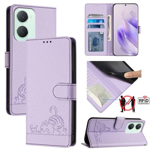 Para Vivo Y03 4G Global Cat Rat Estuche para Teléfono de Cuero Rfid con Patrón En Relieve y Cordón (Púrpura)