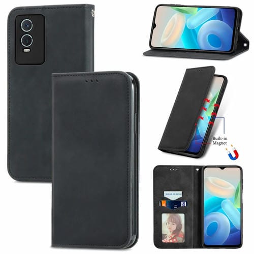 Para Vivo Y76S, Retro, Piel, Funda de Cuero con Flip Magnético (Negro)