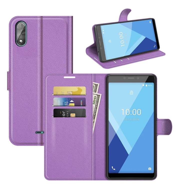 Funda Protectora Flip Wiko Y51 Litchi Texture con Soporte y Ranuras para Tarjetas y Billetera (Púrpura)