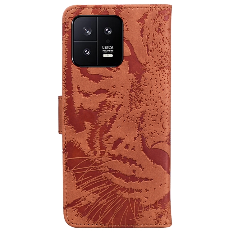 Para Xiaomi 13 5G Caja del Teléfono de Cuero con Estampado de Tigre En Relieve (Marrón)