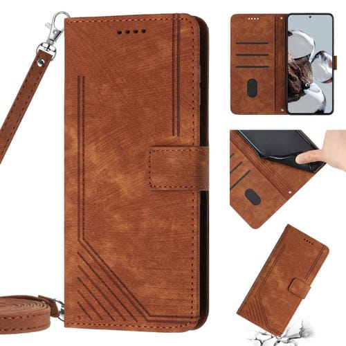 Para Xiaomi 13 Pro Skin Feel Stripe Pattern Funda de Cuero para Teléfono con Cordón (Marrón)