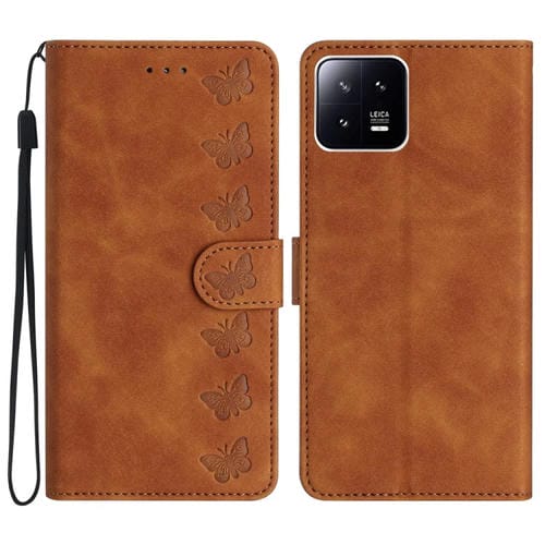 Para Xiaomi 13 Seven Butterflies Caja de Teléfono de Cuero En Relieve (Marrón)