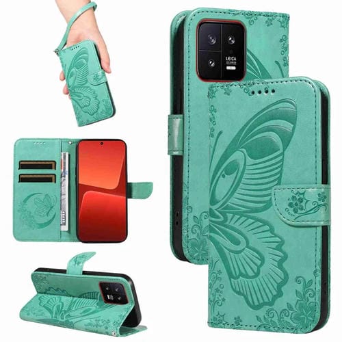 Para Xiaomi 13 Swallowtail Butterfly Funda de Teléfono de Cuero En Relieve (Verde)
