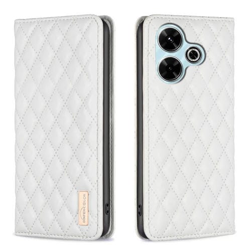 Para Xiaomi Poco M6 4G / Redmi 13 4G Funda para Teléfono con Tapa de Cuero Magnético Diamond Lattice (Blanco)