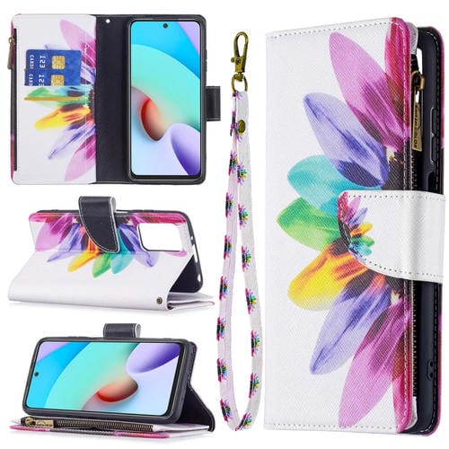Para Xiaomi Redmi 10 Coloreado Dibujo con Cremallera Caja de Cuero de la Flip Horizontal con Soporte y Ranuras para Tarjetas y Billetera (Flor de Sol)