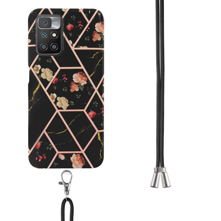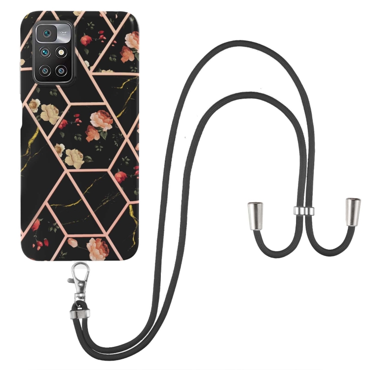 Para Xiaomi Redmi 10 Electrochaplating Flower Mármol TPU Funda Telefónica con Cordón (Flor Negra)