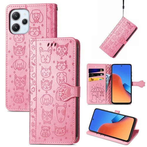 Para Xiaomi Redmi 12 Cat And Dog Estuche de Cuero En Relieve para Teléfono (Rosa)