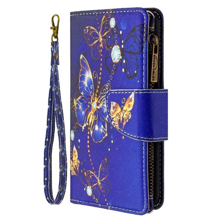 Para Xiaomi Redmi 7A Patrón de Dibujo de Colores Cremallera Funda de Cuero con Tapa Horizontal con Soporte y Ranuras para Tarjetas y Billetera (Mariposa Púrpura)