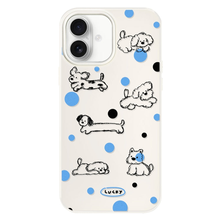 Funda híbrida TPU y policarbonato iPhone 16 Plus función protección (Perrito con Lunares en Blanco)