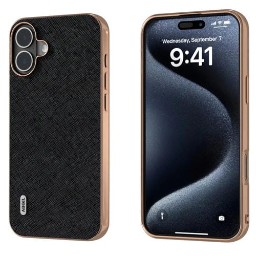 Funda de Cuero Genuino Abeel para iPhone 16 Plus con Textura Cruzada y Marco Galvanizado (Negro)