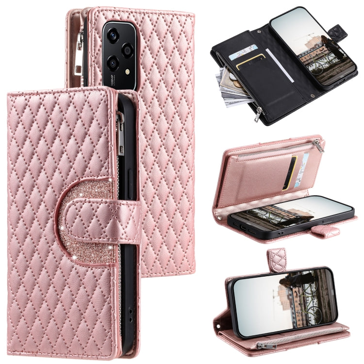 Funda de Cuero para Honor 200 Lite Glitter Lattice Zipper Wallet para Teléfono (Oro Rosa)