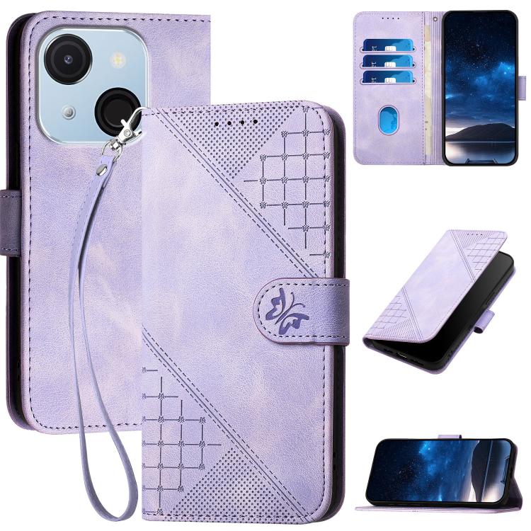 Funda de Cuero Itel A50C con Diseño de Mariposa en Relieve y Cuadrícula con Cordón (Morado Claro)