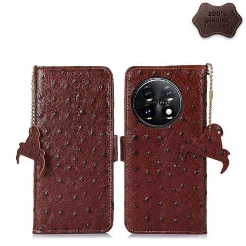 Funda para OnePlus 11 5G de Cuero Genuino con Patrón de Avestruz y Protección RFID (Café)