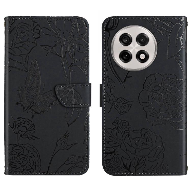 Funda de Cuero con Relieve Peonía y Mariposa para OnePlus 13R (Negro)