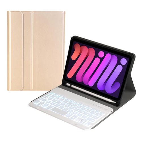 Funda de Cuero Teclado A06Bs con Luz de Fondo Soporte y Ranura Lápiz para iPad Mini 6 (Oro)