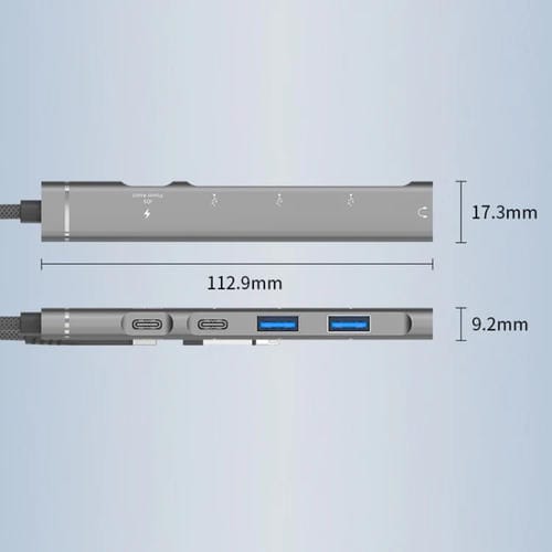 - Interfaz de entrada: Tipo C + 8 pines o Tipo C + USB-A (opcional); interfaz de salida: 1 Puerto de Carga Tipo C, 1 Puerto de datos Tipo C, 2 Puertos USB-A y Conector de audio de 3,5 mm; diseño ligero y Portátil; disipación de calor optimizada y transmisión estable