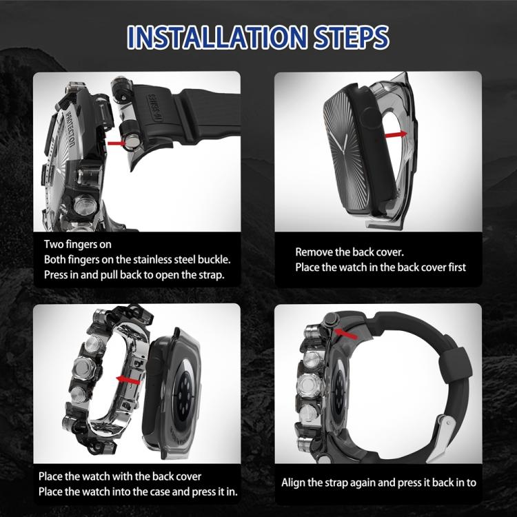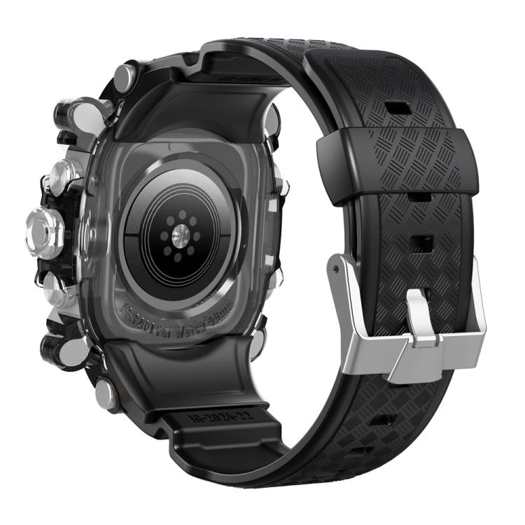 Correa de silicona integrada para Apple Watch Series 10/11 de 46 mm con caja metálica (negro transparente + plata).