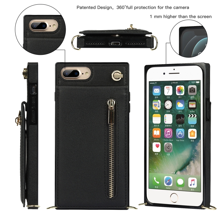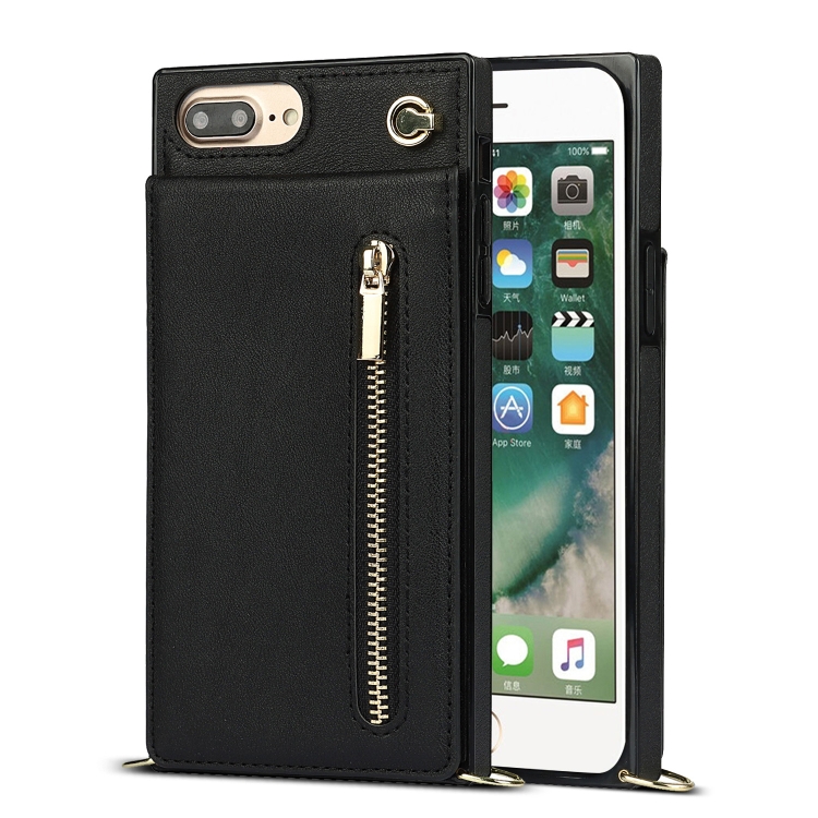 Funda Trasera TPU + PU con Cremallera Cruzada, Soporte, Tragamonedas, Billetera y Correa para iPhone 8 Plus / 7 Plus (Negro)