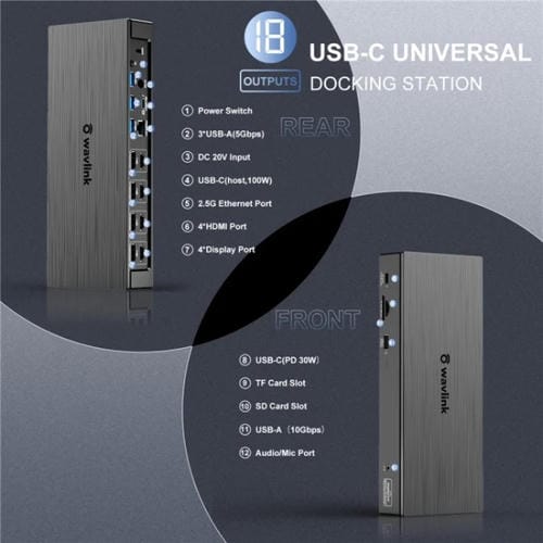 Estación de Acoplamiento Universal USB C Wavlink UG69PD8 Pro 18 en 1 con Pantalla Cuádruple DP/HD 5K (Enchufe Reino Unido)