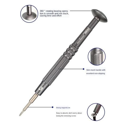 La Herramienta de Reparación Mechanic iMini Series Five Star 0.8 está diseñada para usuarios que requieren precisión en el mantenimiento de dispositivos electrónicos y objetos delicados. Este kit es compatible con Teléfonos Móviles, gafas y relojes, ofreciendo una solución profesional para la manipulación de tornillos y Piezas pequeñas. Su cabezal, fabricado en aleación de acero forjado de alta dureza, garantiza durabilidad y resistencia al desgaste, mientras que su diseño incluye un sistema de rotación de rodamientos de 360 grados para un funcionamiento suave y eficiente. El mango antideslizante facilita el control y la precisión durante la Reparación, y el cabezal magnético asegura que los tornillos se mantengan en su lugar, evitando pérdidas durante el trabajo.