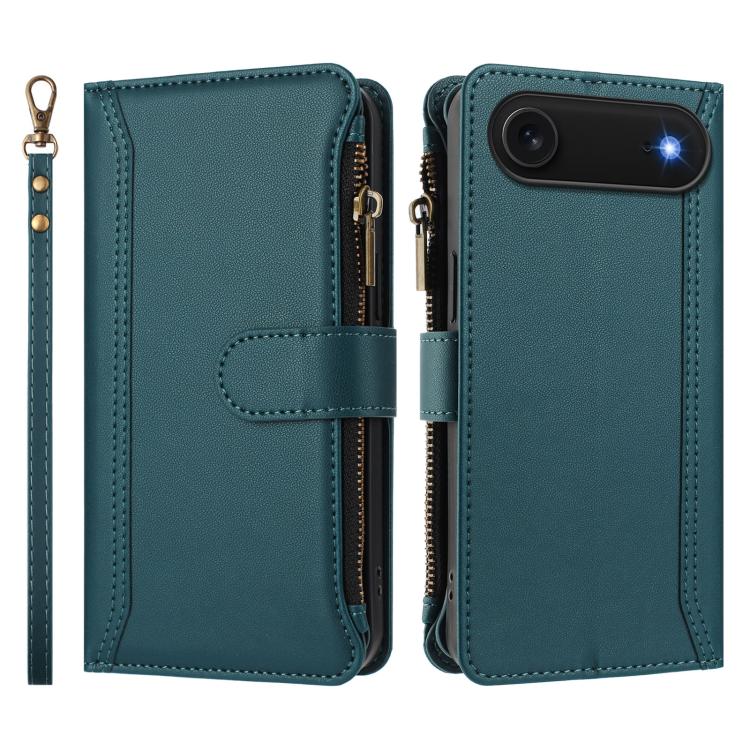 Funda de cuero con cierre magnético para iPhone Air, 9 ranuras para tarjetas, cremallera y correa de mano (verde oscuro)