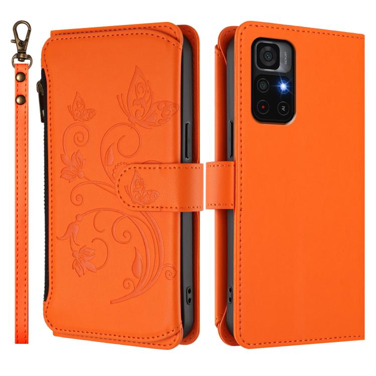 Funda de cuero con cremallera para Redmi Note 11S 5G y Xiaomi Poco M4 Pro 5G, diseño de mariposas y flores, con múltiples tarjetas (naranja)
