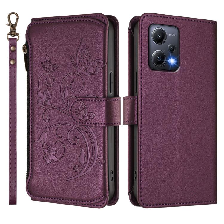 Funda de cuero con cremallera para Redmi Note 12 5G Global / Xiaomi Poco X5, diseño de mariposas, flores y múltiples tarjetas (morado oscuro)