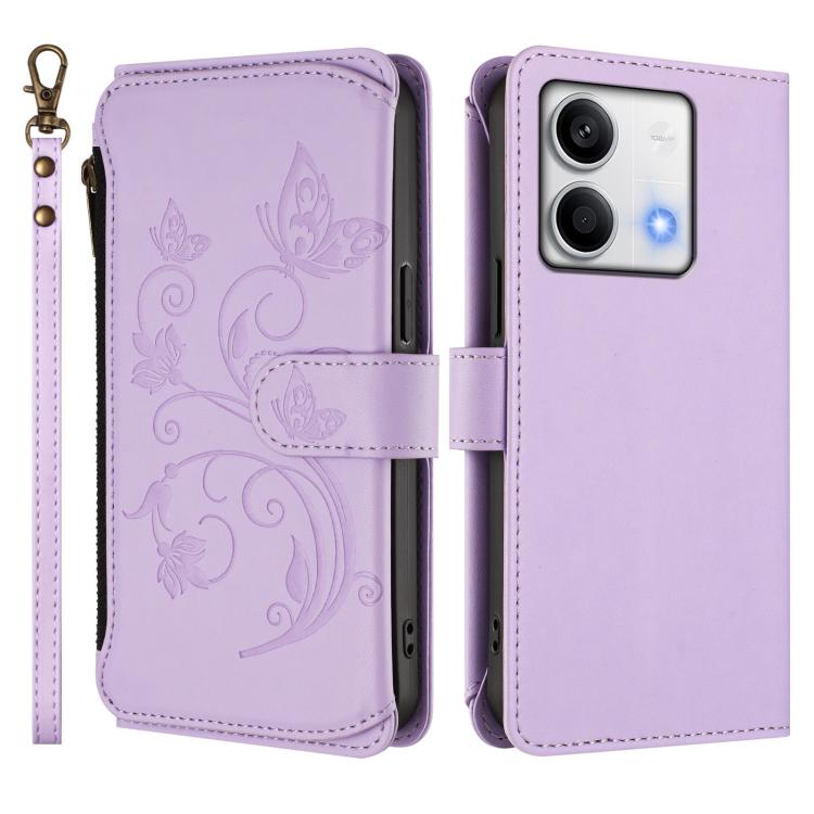 Funda de cuero con cremallera para Redmi Note 13 5G, diseño de mariposas, flores y múltiples tarjetas (morado claro)