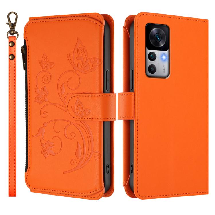Funda de cuero con cremallera para Xiaomi 12T / 12T Pro / Redmi K50 Ultra, diseño de mariposas, flores y mariposas (naranja)