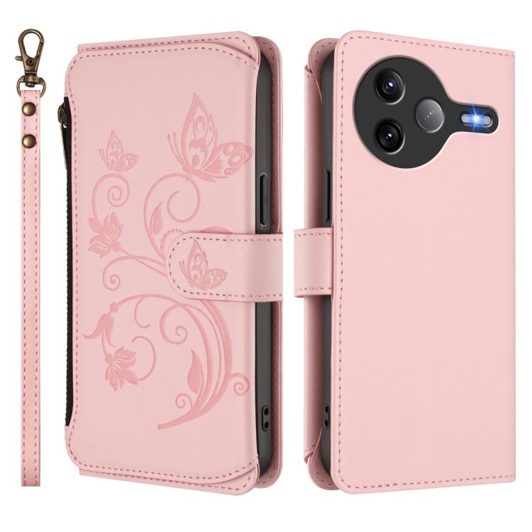 Funda de cuero con cremallera para Xiaomi Poco F7 Ultra / Redmi K80 Pro, diseño de mariposas y flores, con múltiples tarjetas (rosa)