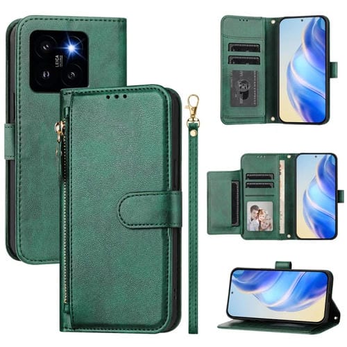 Funda de Cuero con Cremallera y Ranuras para Múltiples Tarjetas para Xiaomi 14 Pro Global (Verde)