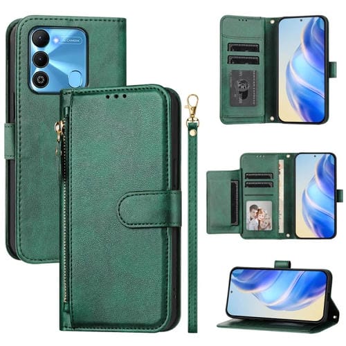 Funda de Cuero con Cremallera y Ranuras para Tarjetas para Tecno Spark Go 2022 / Spark 8C / Spark 9 (Verde)