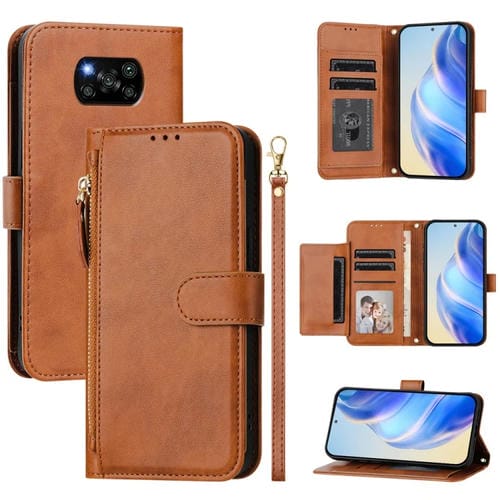 Funda de Cuero con Cremallera y Ranuras para Varias Tarjetas para Xiaomi Poco X3 Pro (Marrón)