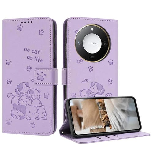 Funda de Cuero para Honor X60/X9C con Diseño de Gatito en Relieve y Cordón (Morado)