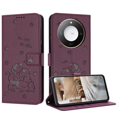 Funda de Cuero Honor X60/X9C con Diseño de Gatito en Relieve y Cordón (Rojo Vino)