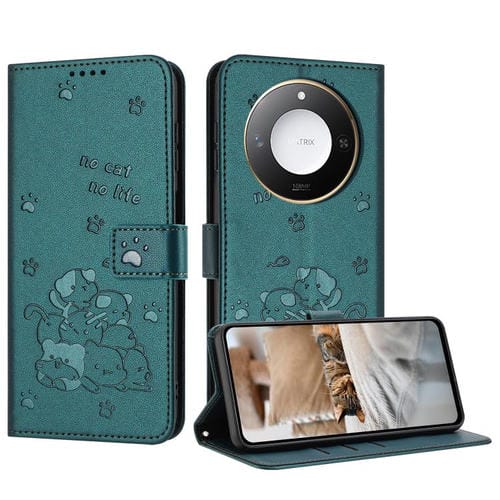 Funda de Cuero Honor X60/X9C con Diseño de Gatito en Relieve y Cordón (Verde Oscuro)