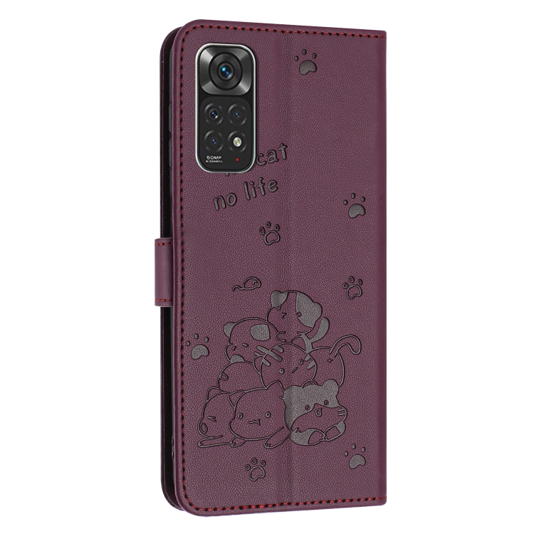 Funda de Cuero con Estampado de Gatito En Relieve para Redmi Note 12S 4G con Cordón (Rojo Vino)