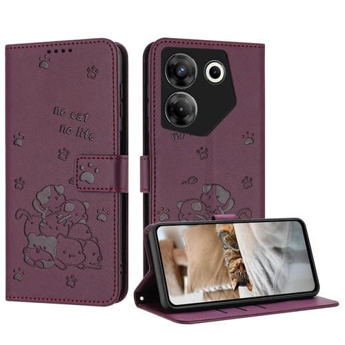 Funda de Cuero para Tecno Camon 20 Pro 5G con Diseño de Gatito en Relieve y Cordón (Rojo Vino)