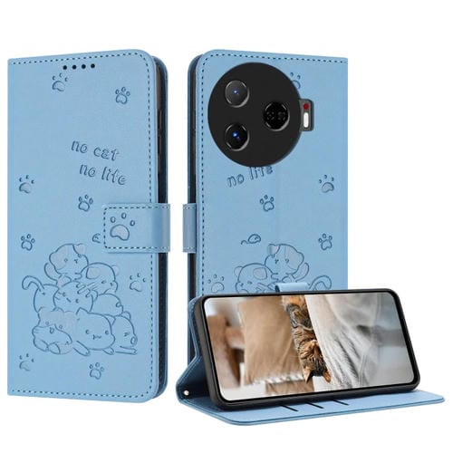 Funda de Cuero para Tecno Camon 30 Pro 5G con Diseño de Gatito en Relieve y Cordón (Azul)