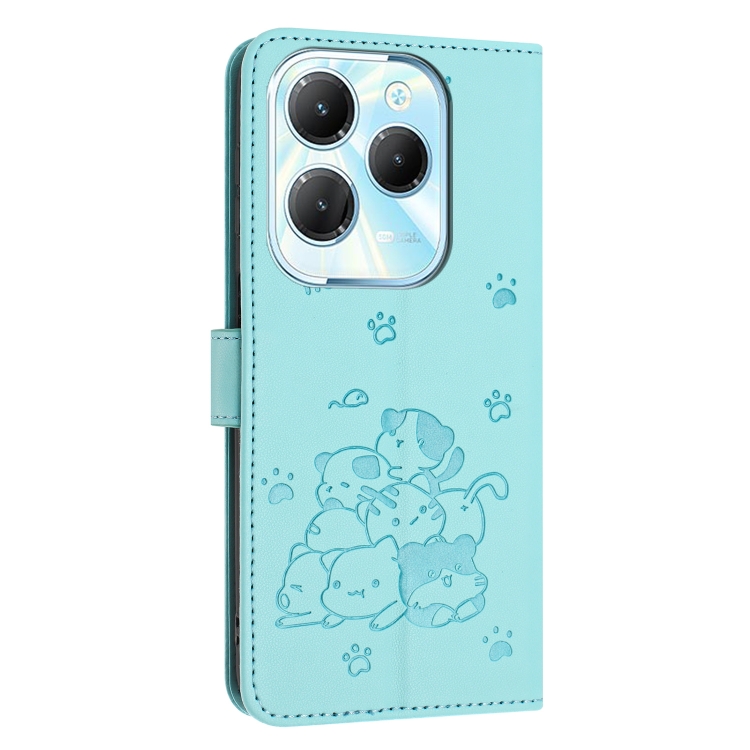 Funda de Cuero para Tecno Spark 20 Pro con Diseño de Gatito en Relieve y Cordón (Verde Menta)