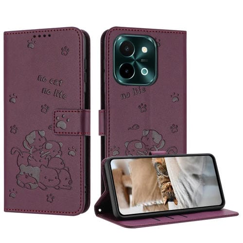 Funda de Piel con Diseño de Gatito En Relieve y Cordón para Vivo Y28 4G / Iqoo Z9X 5G (Rojo Vino)