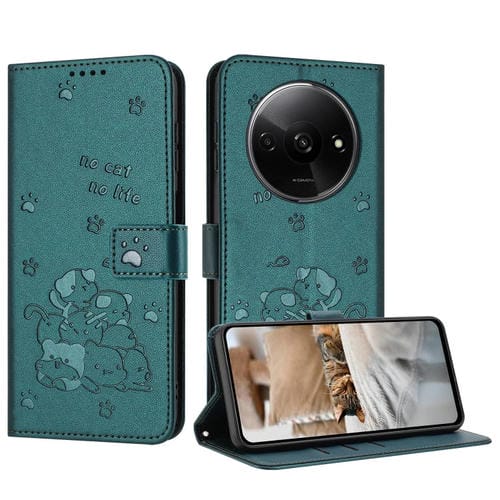 Funda de Piel con Diseño de Gatito En Relieve y Cordón para Redmi A3 4G Global / A3X 4G (Verde Oscuro)