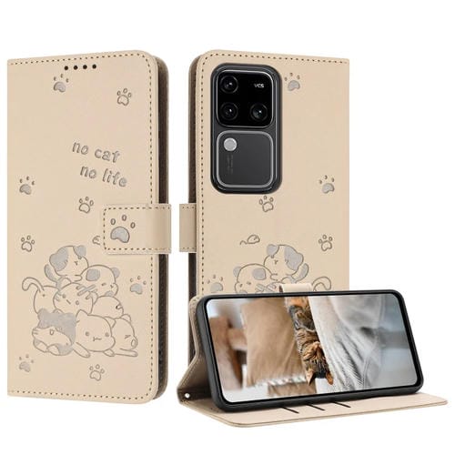 Funda de Piel con Diseño de Gatito En Relieve y Cordón para Vivo S18/S18 Pro (Beige)