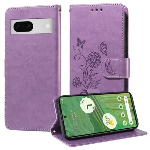Funda de Cuero para Google Pixel 7 Pro con Diseño de Mariposas y Flores en Relieve (Morado)