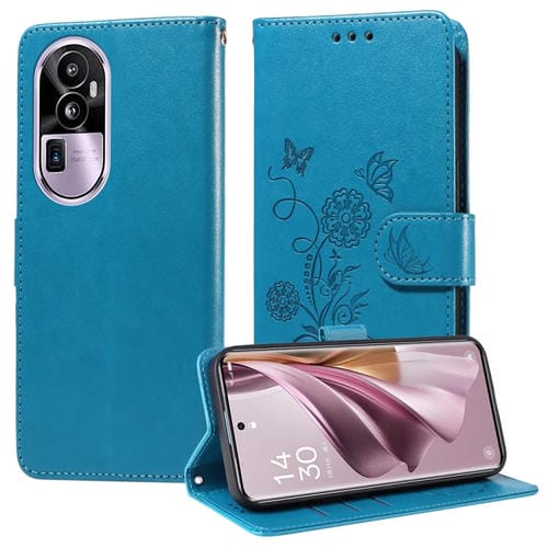 Funda de Cuero con Diseño de Mariposas y Flores En Relieve para Oppo Reno10 Pro+ (Azul)