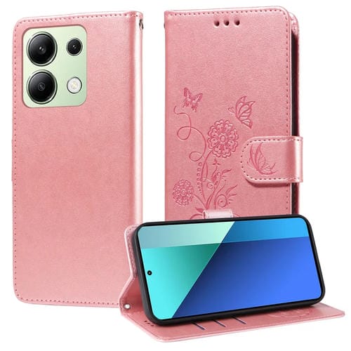 Funda de Cuero con Diseño de Mariposas y Flores En Relieve para Redmi Note 13 4G (Oro Rosa)