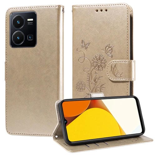 Funda de Cuero con Diseño de Mariposas y Flores En Relieve para Vivo Y35 4G / Y22S / Y22 (Dorada)