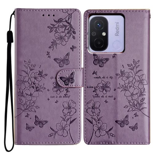 Funda de Cuero con Diseño de Mariposas y Flores para Redmi 12C (Morado)