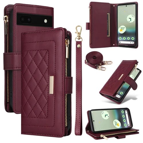 Funda de Cuero con Diseño de Rombos y Billetera Cruzada con Cremallera para Google Pixel 7A (Rojo Vino)