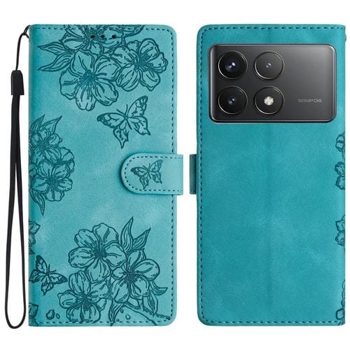 Funda de Cuero con Estampado de Flores y Mariposas para Xiaomi Poco F6 Pro (Azul Cielo)
